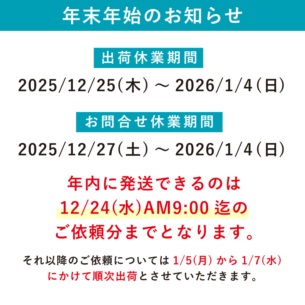 年内に発送できるのは12/24(水)AM9:00迄のご依頼分までとなります。